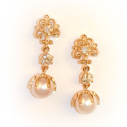 14k yellow gold diamond and pearl dangle earrings, 4.5 grams. Each contains a 7-7.5mm salt water cultured pearl, a 2+mm and a 4mm round old cut diamonds, all set in six prongs