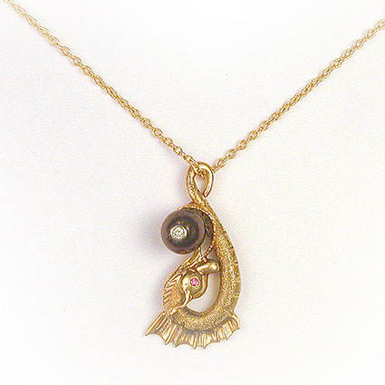 18k yellow gold modified estate piece weighing 2.7 grams. There is a 6mm black pearl containing a 1.5mm round brilliant cut SI-G/H diamond set in a platinum bezel. This is shown on a cable chain, not included.